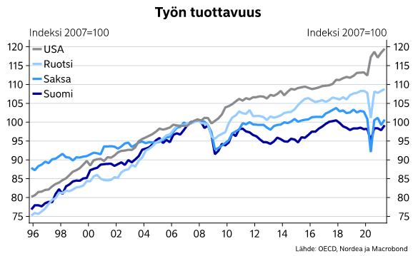 Finanssikriisin seurauksena Suomen tuottavuuskasvu pysähtyi melkein kymmeneksi vuodeksi, saavuttaen vuoden 2007 tason vasta vuonna 2017. Tuottavuuden kasvun hidastumisen taustalla on useita syitä, mutta matkapuhelinalan luhistuminen ja sen seurauksena tutkimus- ja tuotekehitysinvestointien väheneminen on ollut merkittävä tekijä.